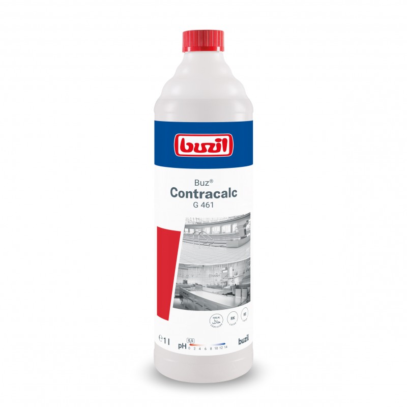 Buzil Buz Contracalc G461 ist ein transparenter, flüssiger Entkalker, Fettlöser und Grundreiniger auf Phosphorsäurebasis für den gesamten Sanitär-, Bäder- und Lebensmittelbereich. Mit Buz Contracalc reinigen sie hochwirksam alle säurebeständigen Oberflächen von Kalkverkrustungen, Rost und Kesselstein. RK-gelistet und RE-gelistet sowie Halal zertifiziert nach © HALAL CONTROL.
