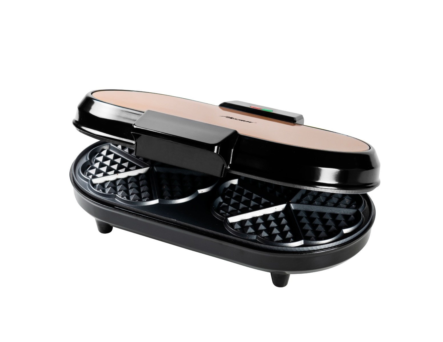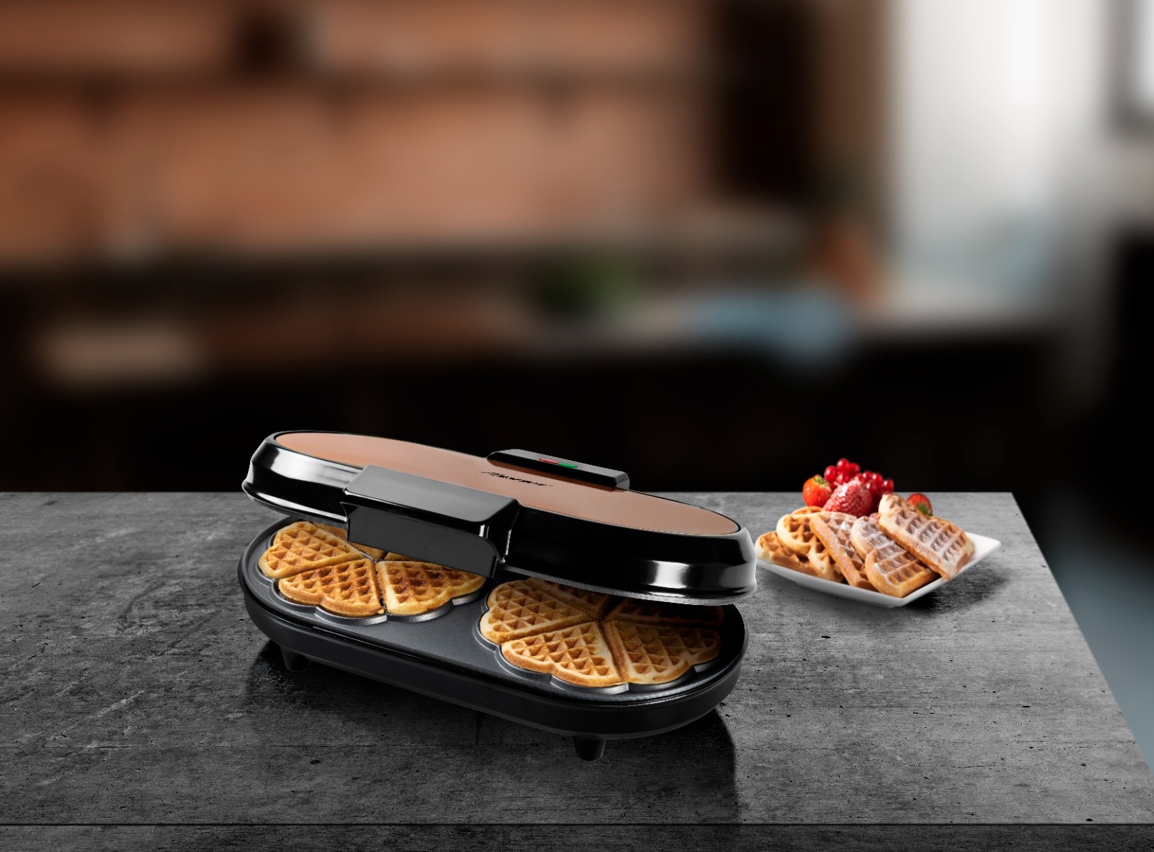• In hochwertigem Kupfer-Design • Doppel-Waffelmaker für die Zubereitung von 2 x 5 klassischen Waffelherzen • Automatische Temperaturregelung inkl. Backampel • Schnelles Aufheizen innerhalb weniger Minuten • Mit Antihaftbeschichtung zum leichten Entnehmen der Waffeln sowie zur einfachen Reinigung • Hitzebeständiges Gehäuse mit wärmeisolierendem Handgriff • Praktische Kabelaufwicklung und optimale Kabellänge: 70 cm