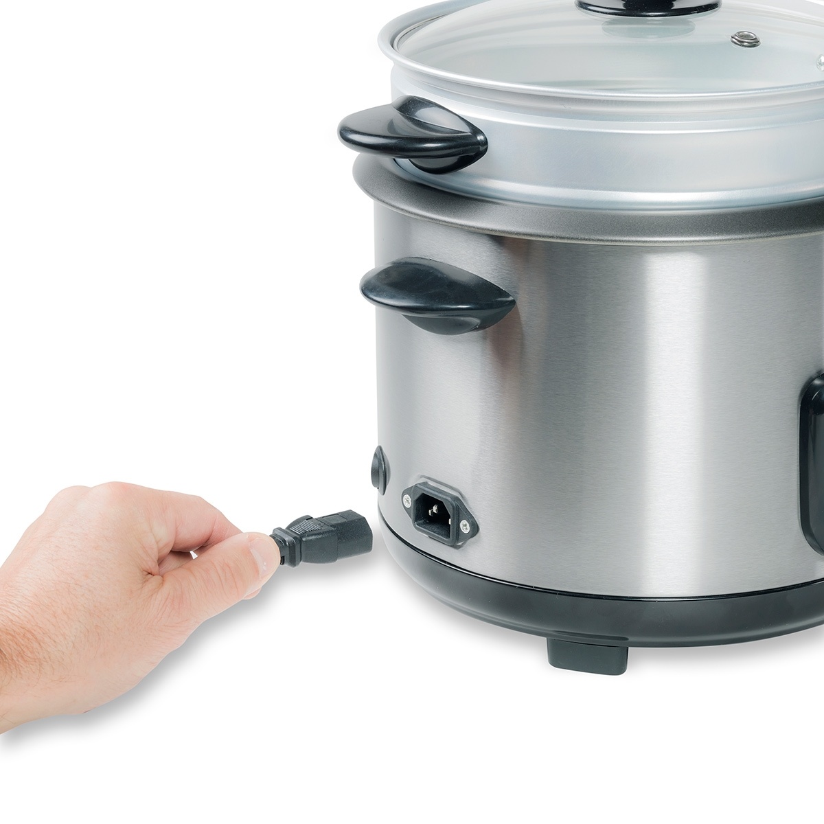 • Kocht schnell und vollautomatisch alle Sorten Reis, z.B. Naturreis, Basmati, Risotto, Wildreis Sushi Reis etc. • Die Warmhaltefunktion hält den Reis für längere Zeit auf der perfekten Temperatur • Extra Dampfgaraufsatz (Ø 19cm) für die gleichzeitige Zubereitung von Gemüse, Fisch, Fleisch etc. • Maximale Kapazität von 1350 g Reis = 9 Tassen Reis = Für 8 - 10 Personen • Einfache Bedienung und automatische Abschaltung • 2 Kontrollleuchten zum Kochen und Warmhalten • Abnehmbare Innenwanne (1.8 Liter) mit Antihaftbeschichtung • Wasserstandsanzeige
