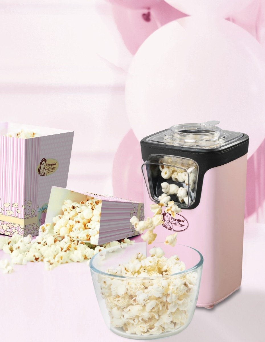 • Ideal für Filmabende oder Kindergeburtstage! • Bereiten Sie süßes oder herzhaftes Popcorn in weniger als 2 Minuten zu • Fettfreie Zubereitung von frischem Popcorn dank Heißlufttechnologie • Integrierter Messbecher • Einfaches Ein- und Ausschalten mit dem großen Druckknopf – soforteinsatzbereit • Integrierter Überhitzungsschutz • Inklusive 10 Popcorntüten!