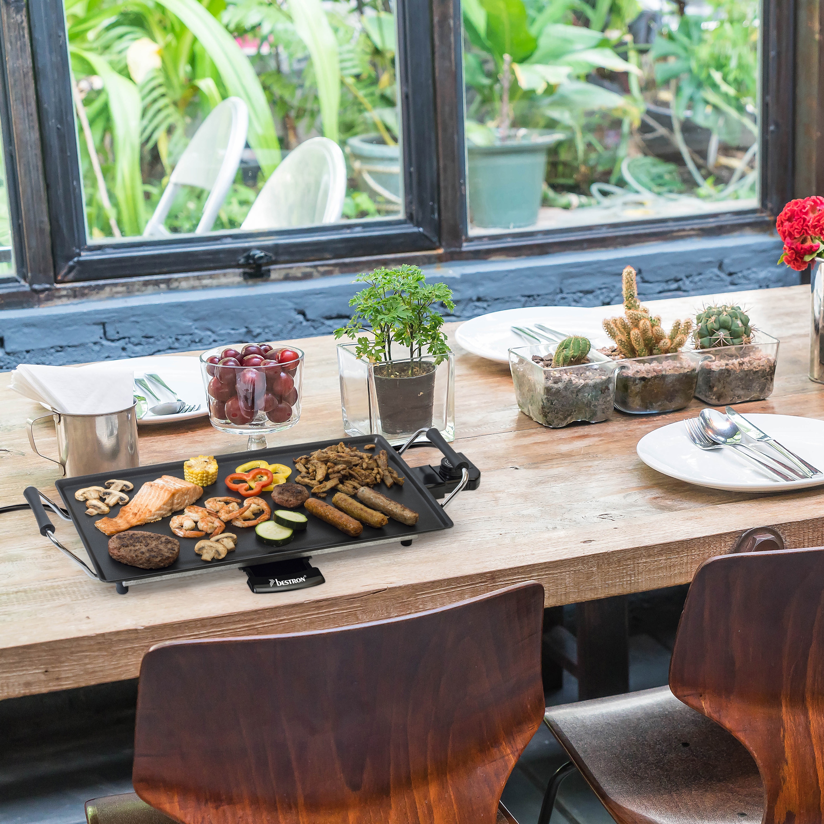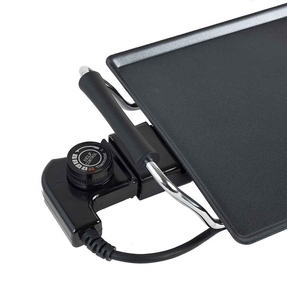 • Große hochwertige Backplatte mit Antihaftbeschichtung (47 x 26 cm) • Unter anderem für Fleisch, Fisch und Gemüse • Abnehmbarer und einstellbarer Temperaturregler mit Kontrollleuchte • Kein Fett oder Öl erforderlich • Auffangrinne und -schale für überschüssiges Fett oder Backrückstände • Für den Innen- und Außenbereich geeignet • Hitzebeständige Griffe