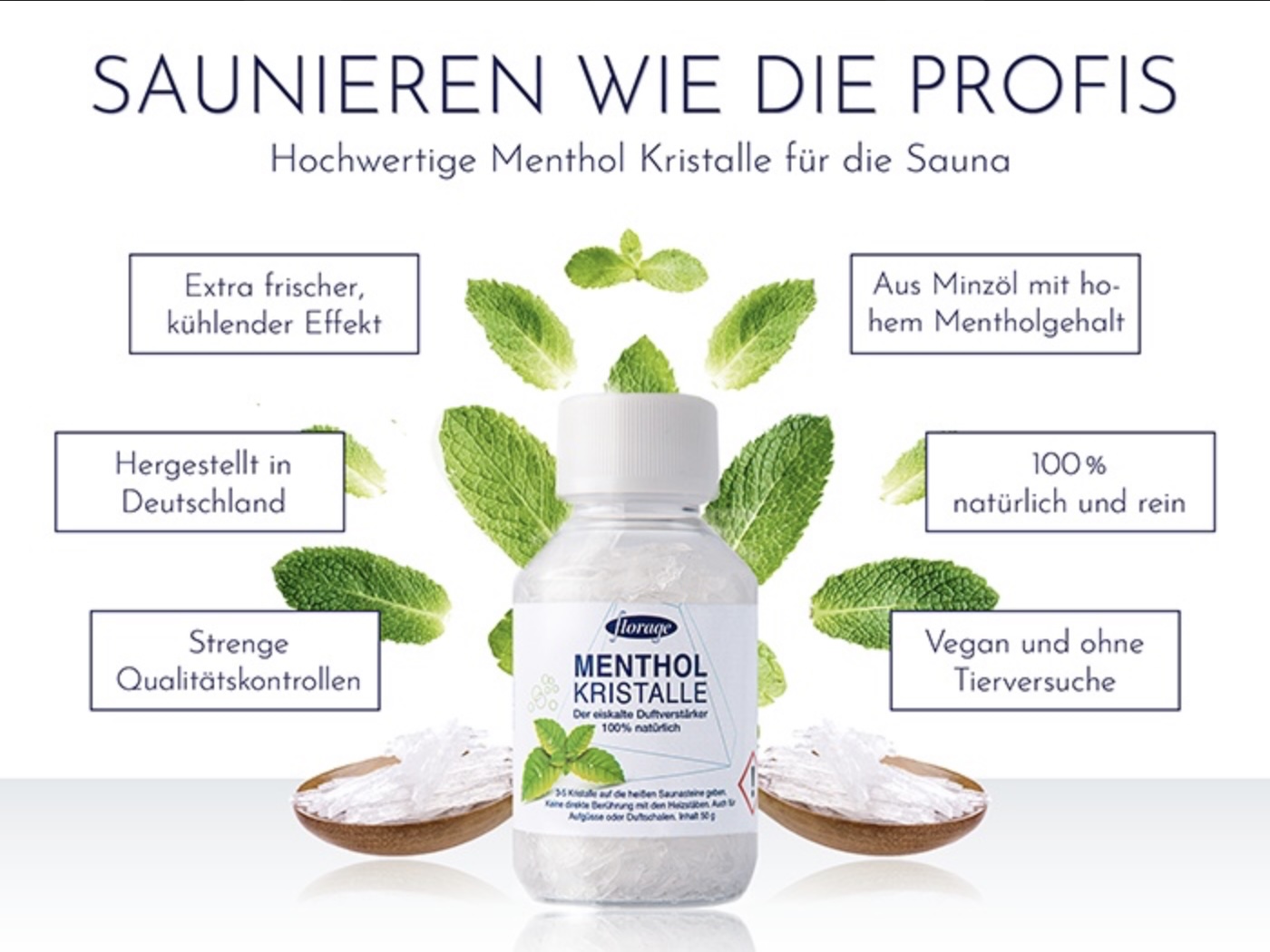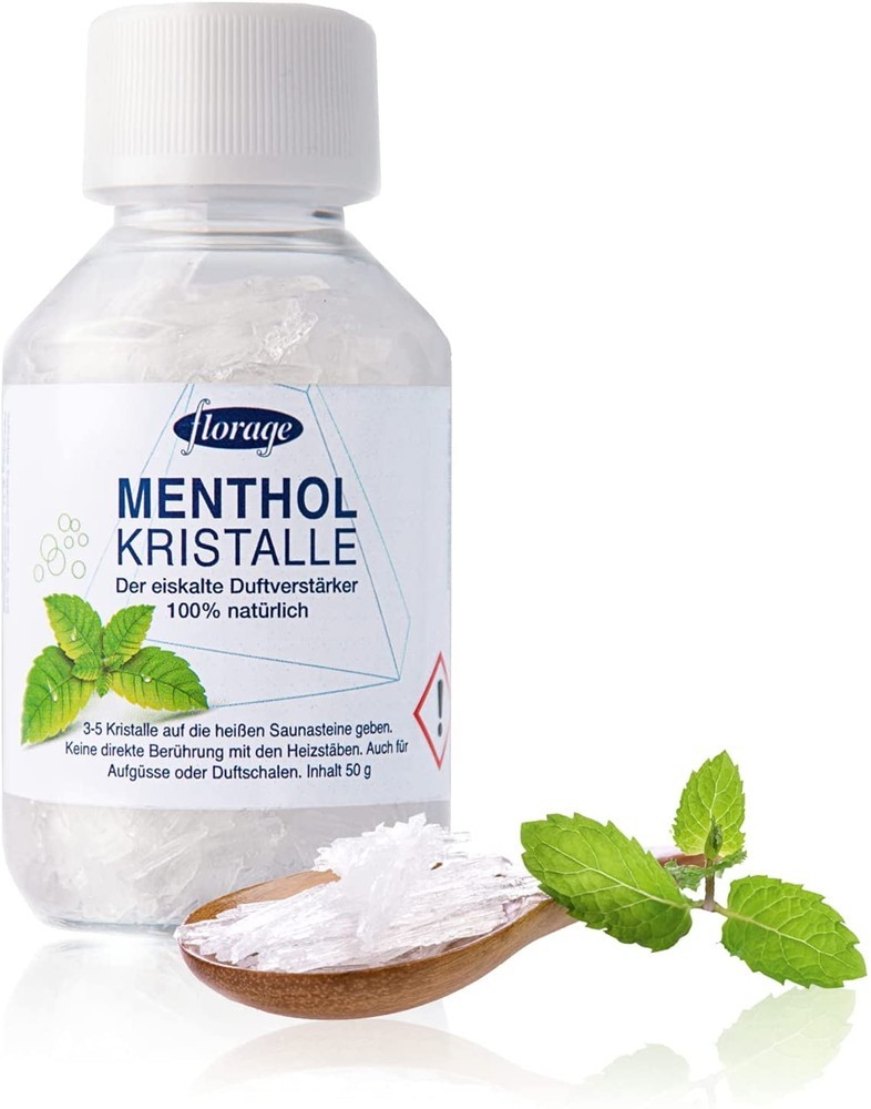 Die Verwendung von Mentholkristallen in der Sauna kann einen Saunaaufguss intensivieren oder für einen zusätzlichen Frische- und Kühleffekt sorgen. Mentholkristalle variieren in der Farbe von transparent bis weiß. Die Kristalle sind bei Zimmertemperatur fest, schmelzen aber bei 42-43°C.
