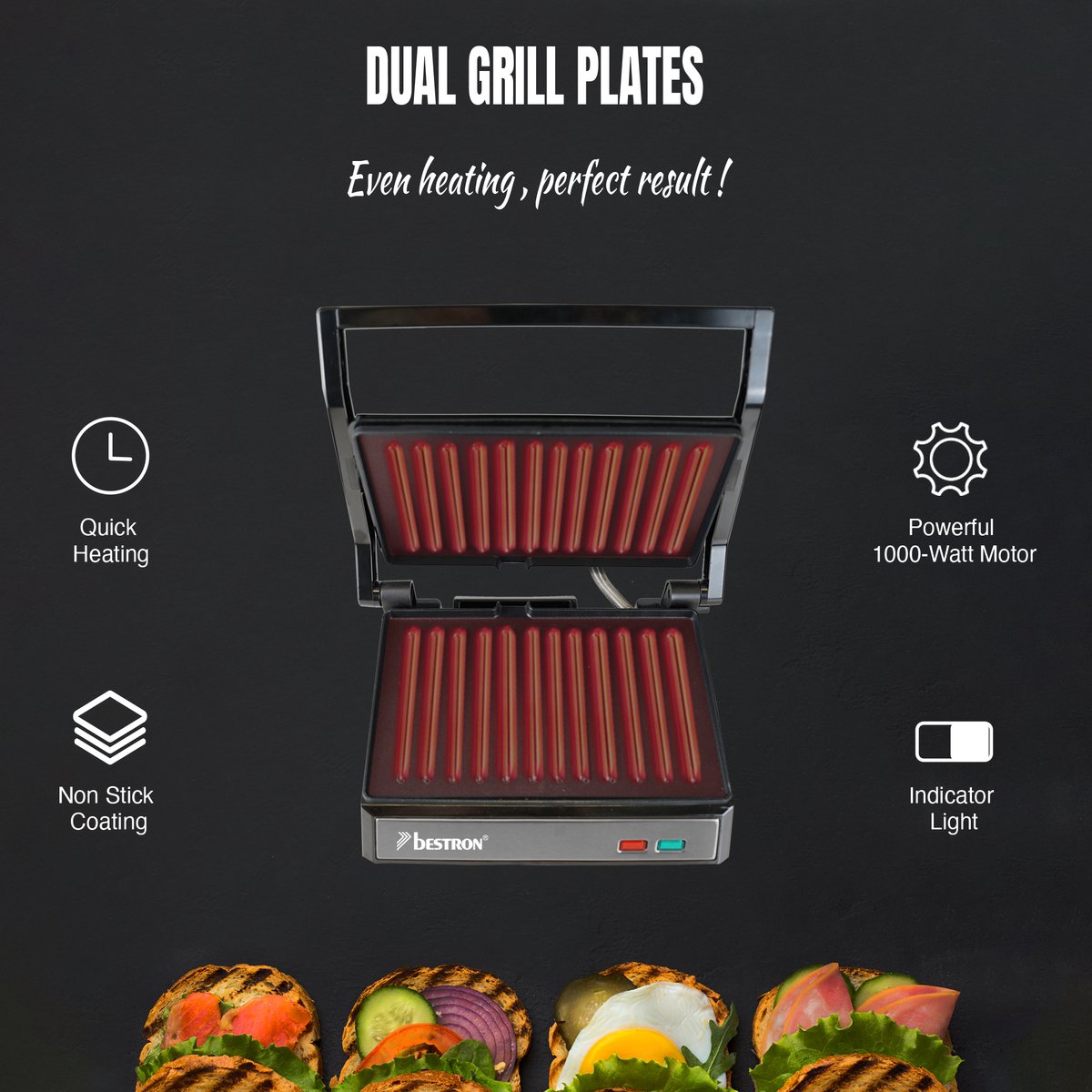 • Vielseitig und schnell bereit zum Grillen und Toasten von: Paninis, Steaks, Toast, Gemüse, Garnelen, Fleisch, Fisch usw.