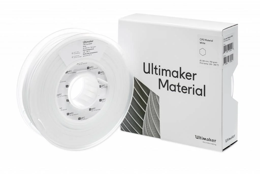 Das Ultimaker CPE Filament besitzt eine hohe Festigkeit und hervorragende Formstabilität, auch über einen langen Zeitraum hinweg. Das aus biologischen Rohstoffen gewonnene Material ist besonders geruchsarm, beständig gegenüber vielen Chemikalien und eignet sich insbesondere für die Herstellung von komplexen technischen Drucken, wie funktionsfähigen Prototypen oder auch mechanisch beanspruchten Bauteilen. Das Filament ist einfach in der Handhabung und zuverlässig in puncto Druckqualität. Es ist mit fast allen gängigen Ultimaker-Druckermodellen kompatibel (Ultimaker S5, Ultimaker 3, Ultimaker 3 Extended, Ultimaker 2+, Ultimaker 2+ Extended, Ultimaker 2, Ultimaker 2 Extended), lässt sich aber auch mit anderen FDM-Druckern verarbeiten. Der in der Filamentspule integrierte NFC-Chip kommuniziert und übermittelt Materialinformationen direkt an die Druckersoftware. (Achtung: Die Chipfunktion kann derzeit nur von Ultimaker S5 und Ultimaker 3 Druckern ausgelesen und genutzt werden!)