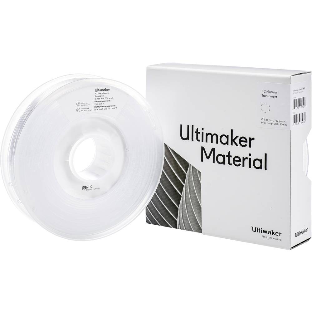 Das Ultimaker PC Filament eignet sich insbesondere für sehr robuste, formstabile und massive Teile. Es überzeugt durch eine sehr starke Zwischenschicht- und Druckbetthaftung, die hohe Materialfestigkeit und eine gute Temperaturbeständigkeit. Polycarbonat besitzt feuerhemmende Eigenschaften und ist selbst bei Temperaturen von bis zu 110°C noch formbeständig. Das Filament eignet sich besonders zur Herstellung von Werkzeugen, Funktionsprototypen und für Kleinserien. Es ist mit fast allen gängigen Ultimaker-Druckermodellen kompatibel, lässt sich aber auch mit anderen FDM-Druckern verarbeiten. Der in der Filamentspule integrierte NFC-Chip kommuniziert und übermittelt Materialinformationen direkt an die Druckersoftware. (Achtung: Die Chipfunktion kann derzeit nur von Ultimaker S5, Ultimaker S3 und Ultimaker 3 3D-Druckern ausgelesen und genutzt werden!)