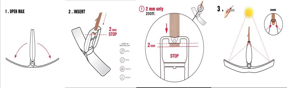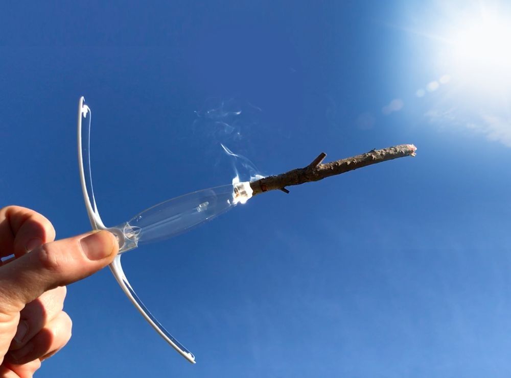 - Se mettre face au soleil : orienter le rayon lumineux sur l’extrémité de l’objet. Une fois le foyer incandescent : retirer et attiser. UTILISATION : PLEIN SOLEIL.